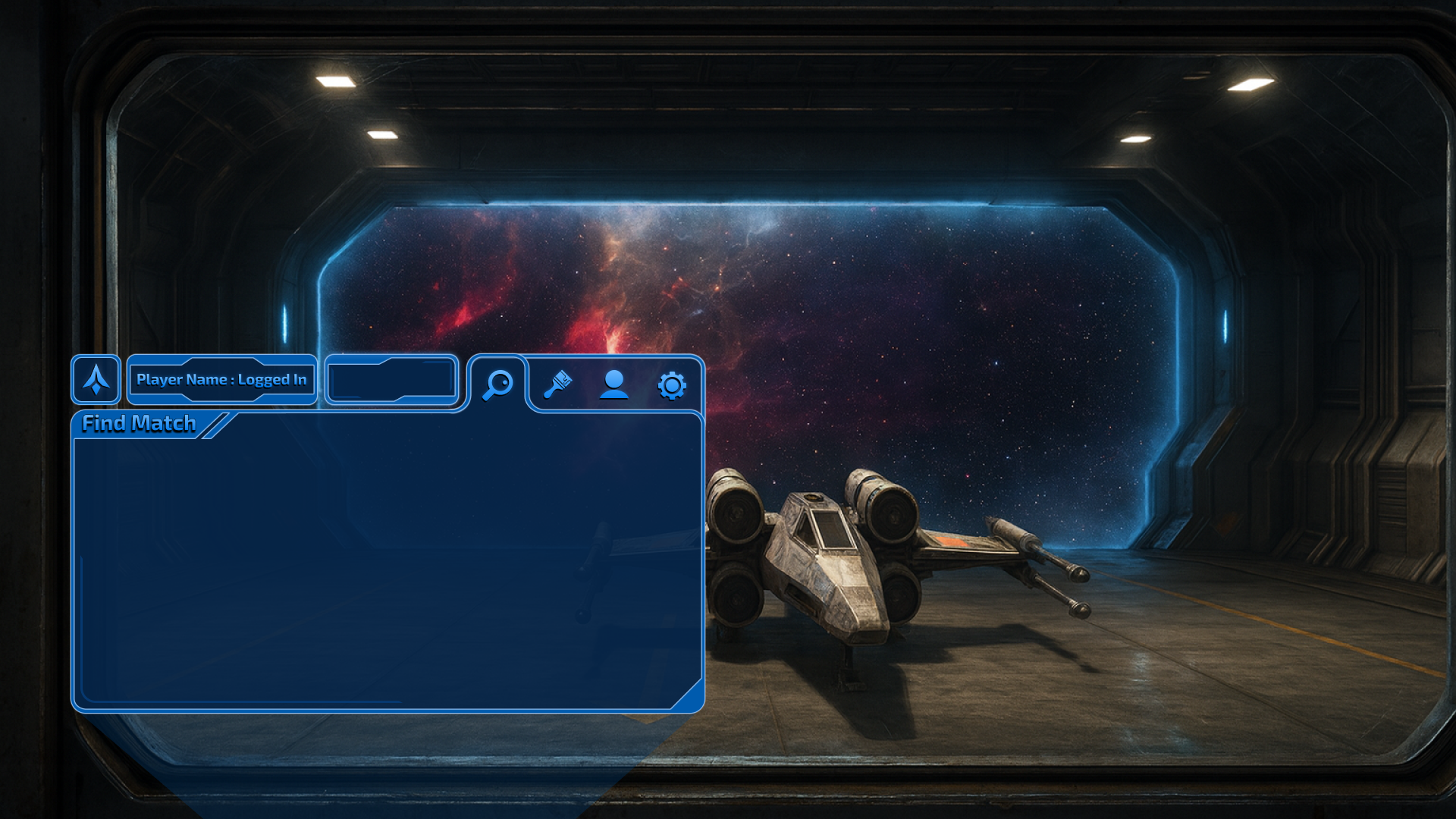 This concept menu was designed for a spaceship shooter game created for The Final Moon. The main menu showcases the player ship displayed inside a futuristic hangar, setting the tone for the space combat experience. A holographic projector style interface appears in the foreground, allowing players to navigate core actions such as finding a match, customizing their ship, viewing and editing their profile, and adjusting settings. The interface uses a blue hued color palette to reinforce the advanced space tech theme while keeping the menu clean, immersive, and visually striking.