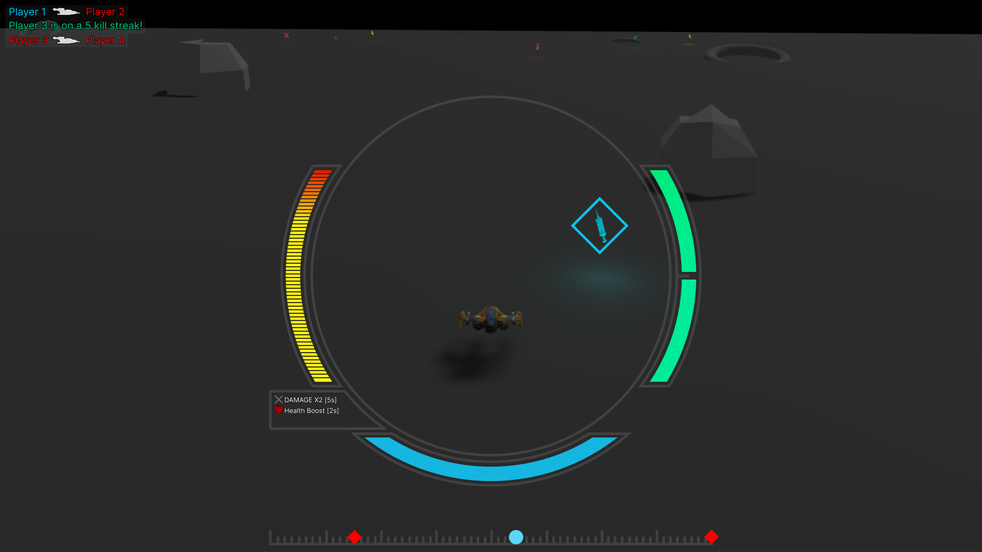 The Player HUD is designed to provide critical gameplay information without obstructing the player’s view. A circular interface frames the player’s ship in a third-person perspective, incorporating the crosshair, speed gauge on the left, boost gauge on the right, and a health gauge along the bottom. Curved gaps between the health gauge and the side gauges create space for a buffs and debuffs panel, which follows the circular design language for consistency. A compass at the bottom of the screen communicates spatial awareness, displaying enemy and pickup locations, while a kill-feed in the top left corner tracks player eliminations with ship icons for visual context. The HUD balances information density with readability, maintaining situational awareness while preserving immersion in the game world.